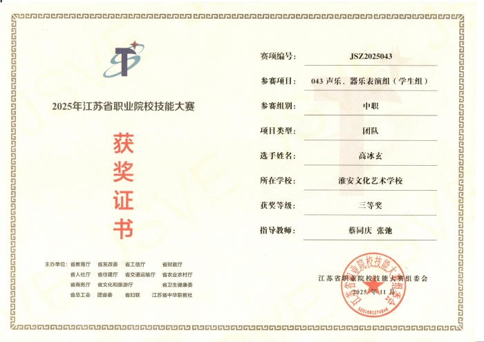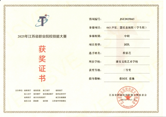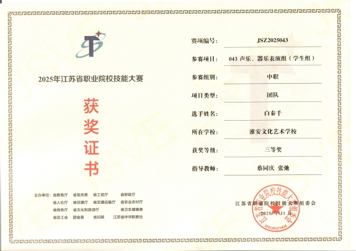 近日,2025年省职业院校技能大赛圆满落幕。淮安文化艺术学校选派的3支参赛团队全部载誉而归,共斩获2项银奖、1项铜奖,实现参赛项目100%获奖的优异成绩,充分展现了学校师生过硬的专业技能和良好的竞技风采。